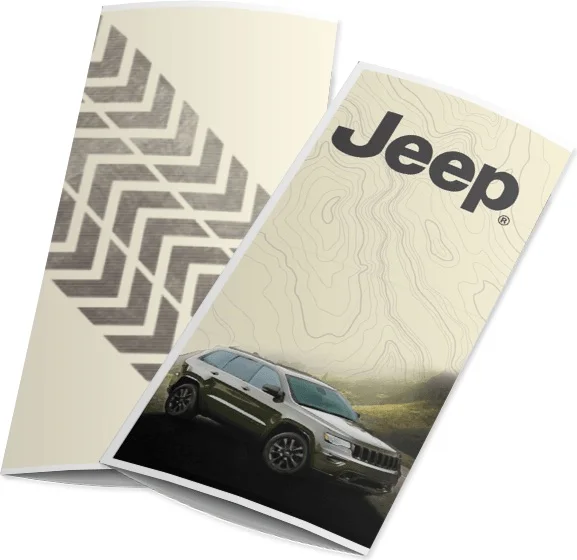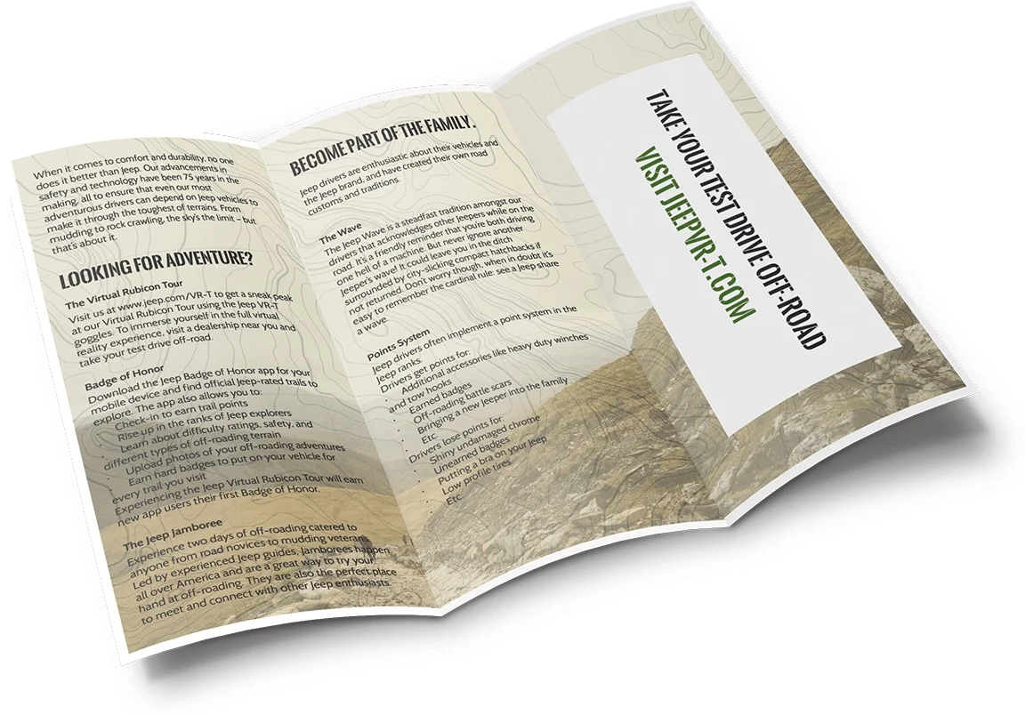 Brochure: A brochure with a set of Jeep VR-T goggles to keep the brand top of mind at the dealership. It showcases what it means to join the Jeep family rather than vehicle facts.