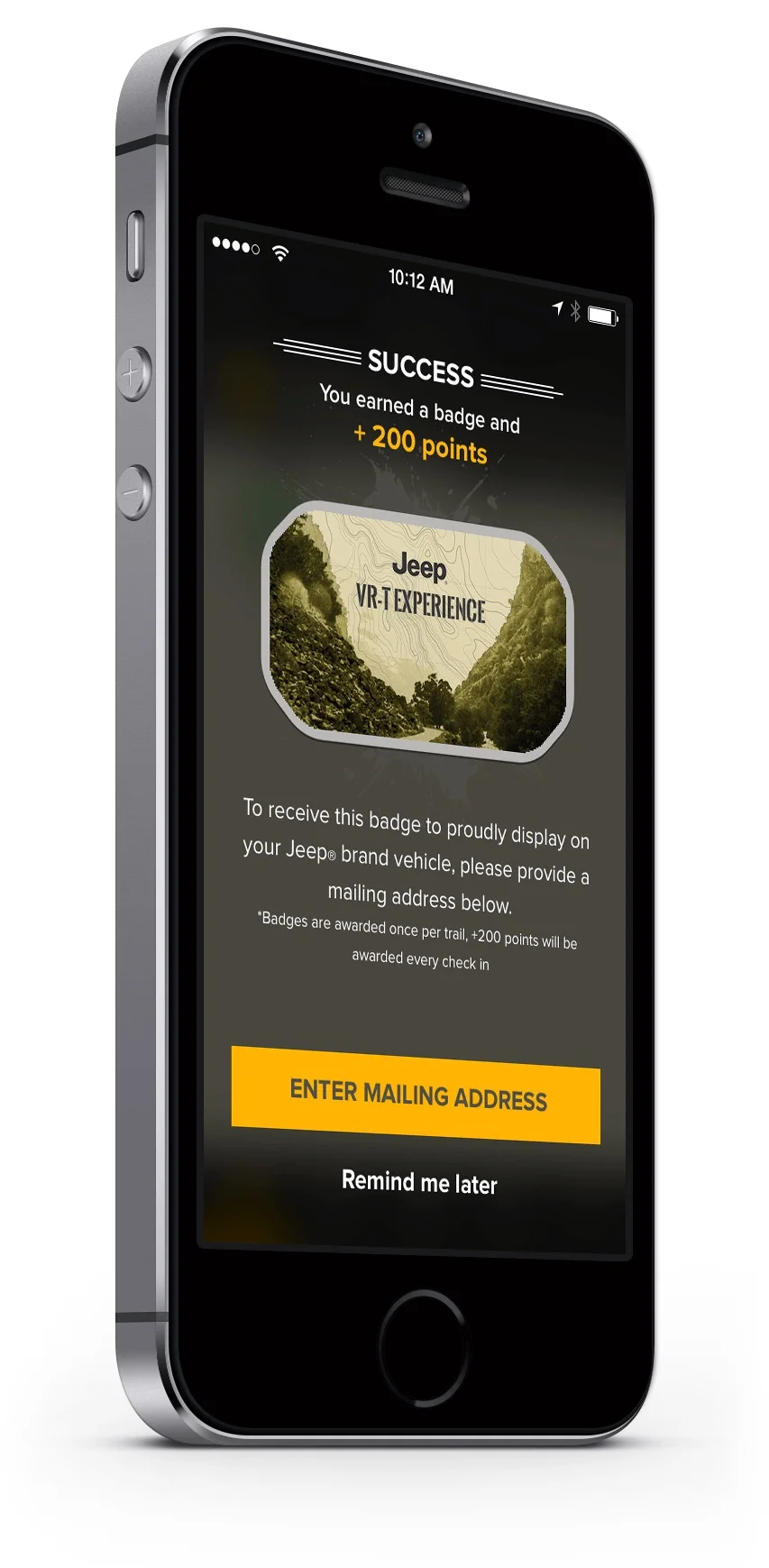 Badge of Honor: All Jeep drivers want to go off-roading, but only 10% of them actually do. Using Jeep's current Badge of Honor App, we created a badge for participants who complete the VR-T experience as incentive to visit Jeep dealerships.